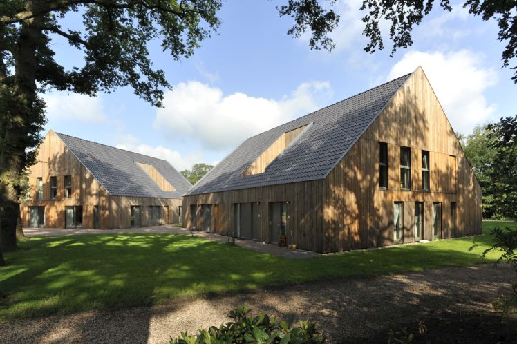 Het meest in het oog springend en spraakmakend zijn de Lariks gevels. Wanneer de schuifluiken gesloten worden is er geen deur of glas meer te zien. Hierdoor lijken de 12 appartementen op 2 schuren die prima in de landelijke omgeving passen.